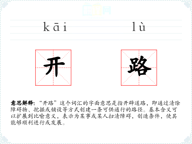 “开路”一词源于汉语,由“开”和“路”两个字组成。在古代汉语中,“开”有打开、开启的意思,“路”指道路。随着语言的发展,“开路”逐渐扩展到比喻意义,用于描述各种扫清障碍的行为。