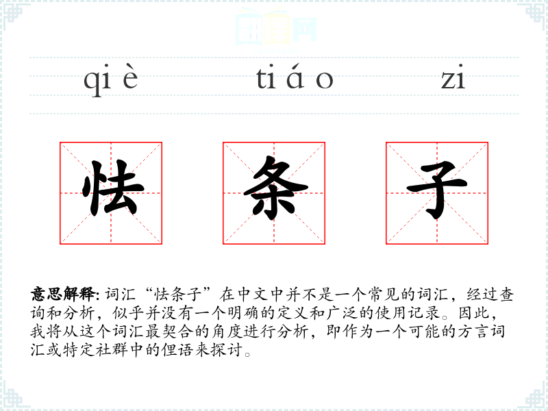 由于“怯条子”不是一个标准的中文词汇,我们无法给出一个确切的字面意思和基本含义。它可能是某个地区方言中的词汇,或者是某个特定社群中的俚语,具体含义需要结合具体语境来理解。