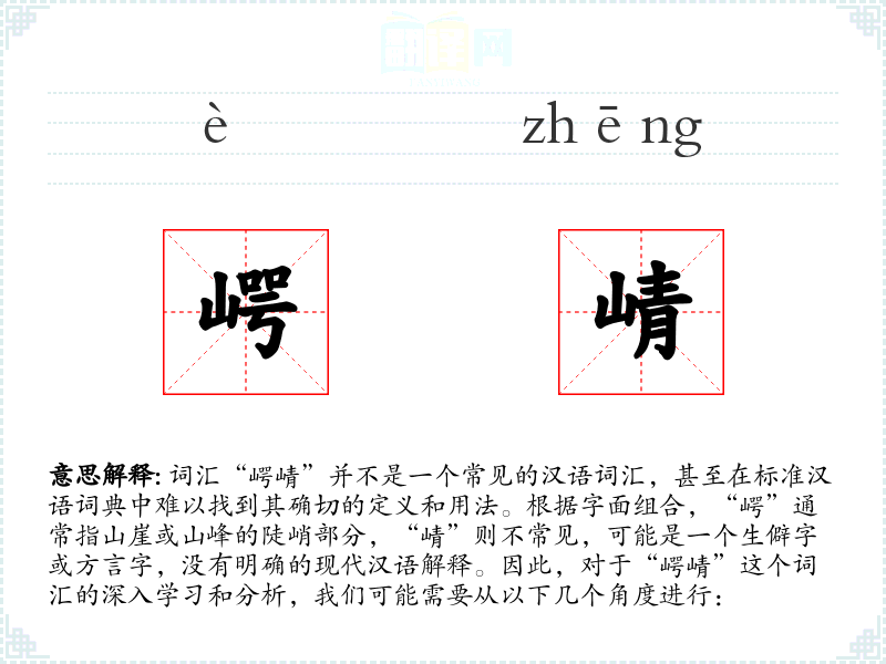 词汇“崿崝”并不是一个常见的汉语词汇,甚至在标准汉语词典中难以找到其确切的定义和用法。根据字面组合,“崿”通常指山崖或山峰的陡峭部分,“崝”则不常见,可能是一个生僻字或方言字,没有明确的现代汉语解释。因此,对于“崿崝”这个词汇的深入学习和分析,我们可能需要从以下几个角度进行: