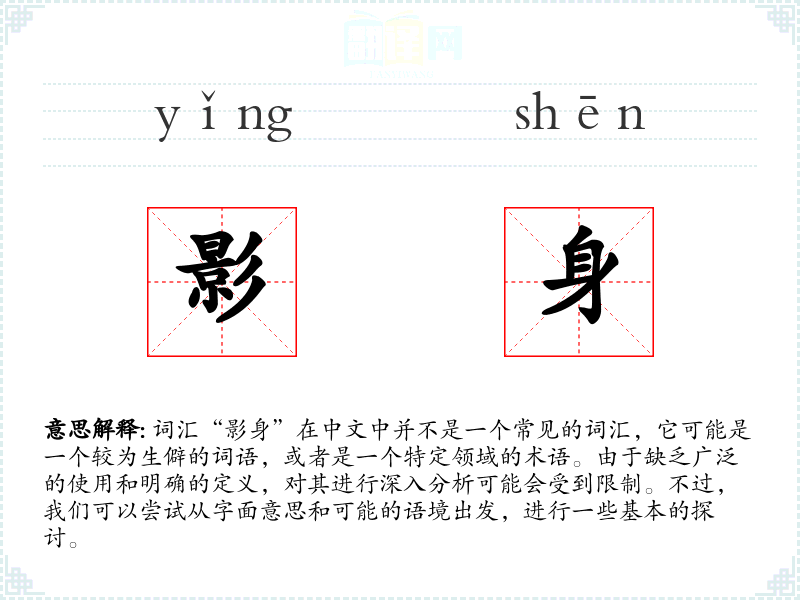 词汇“影身”在中文中并不是一个常见的词汇,它可能是一个较为生僻的词语,或者是一个特定领域的术语。由于缺乏广泛的使用和明确的定义,对其进行深入分析可能会受到限制。不过,我们可以尝试从字面意思和可能的语境出发,进行一些基本的探讨。