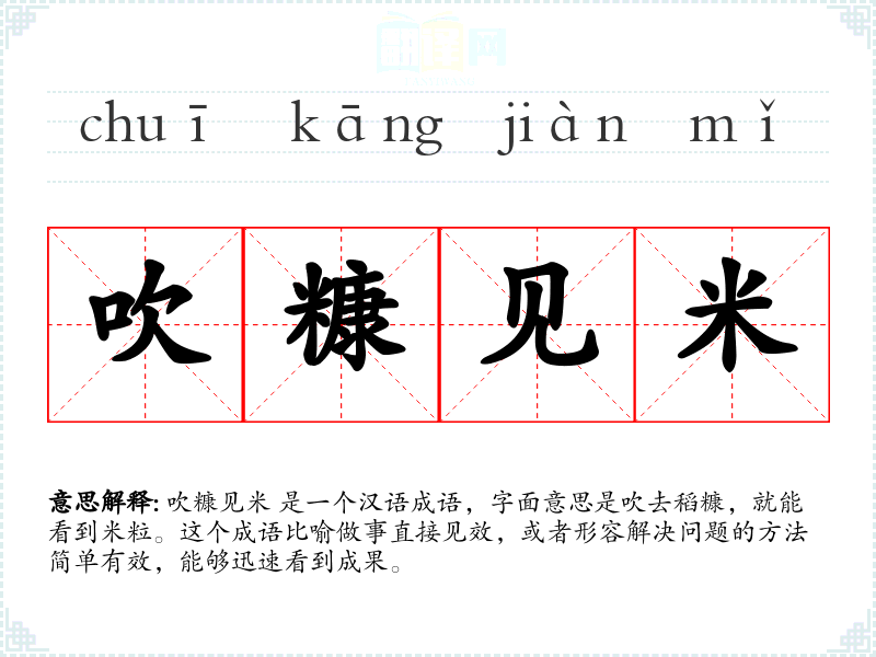 吹糠见米 是一个汉语成语,字面意思是吹去稻糠,就能看到米粒。这个成语比喻做事直接见效,或者形容解决问题的方法简单有效,能够迅速看到成果。