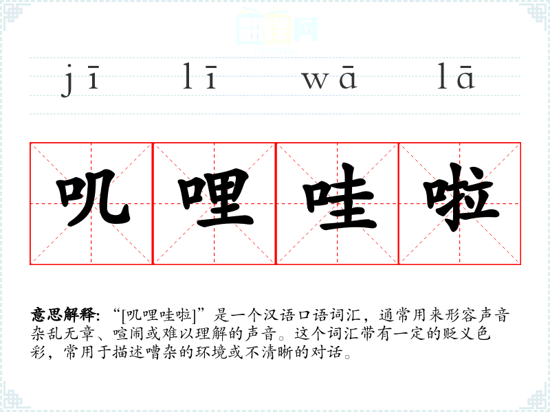 “[叽哩哇啦]”是一个汉语口语词汇,通常用来形容声音杂乱无章、喧闹或难以理解的声音。这个词汇带有一定的贬义色彩,常用于描述嘈杂的环境或不清晰的对话。