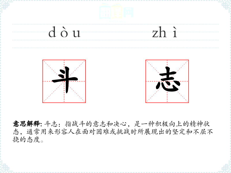 斗志:指战斗的意志和决心,是一种积极向上的精神状态,通常用来形容人在面对困难或挑战时所展现出的坚定和不屈不挠的态度。