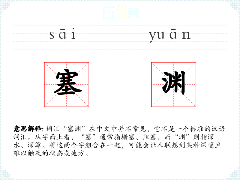 由于“塞渊”不是一个常用词汇,它的词源和历史演变不详。可能是由“塞”和“渊”两个字组合而成,用以形容某种深邃且封闭的状态。