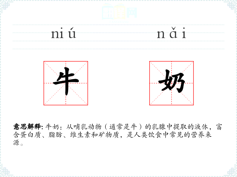 牛奶:从哺乳动物(通常是牛)的乳腺中提取的液体,富含蛋白质、脂肪、维生素和矿物质,是人类饮食中常见的营养来源。