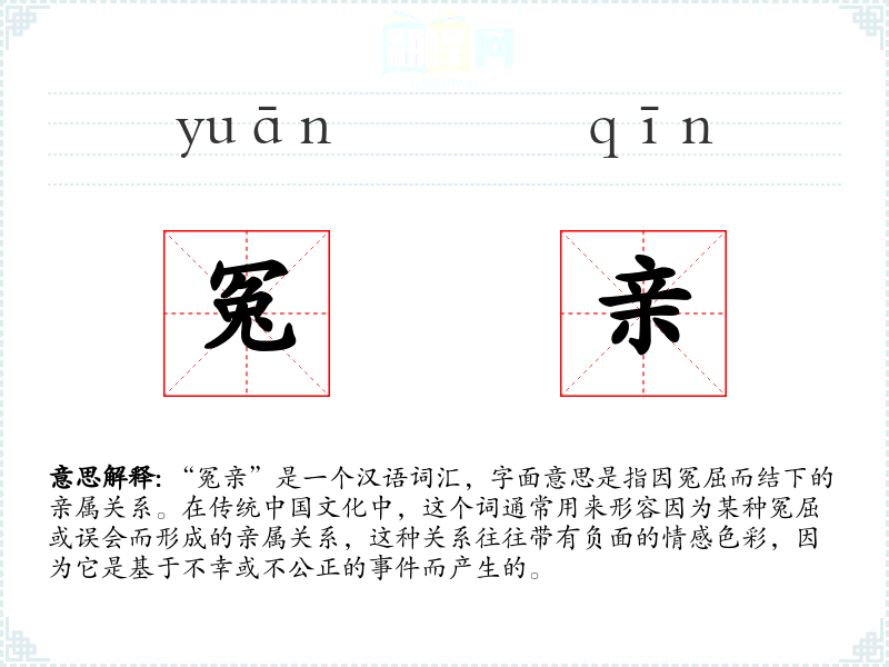 “冤亲”是一个汉语词汇,字面意思是指因冤屈而结下的亲属关系。在传统文化中,这个词通常用来形容因为某种冤屈或误会而形成的亲属关系,这种关系往往带有负面的情感色彩,因为它是基于不幸或不公正的而产生的。