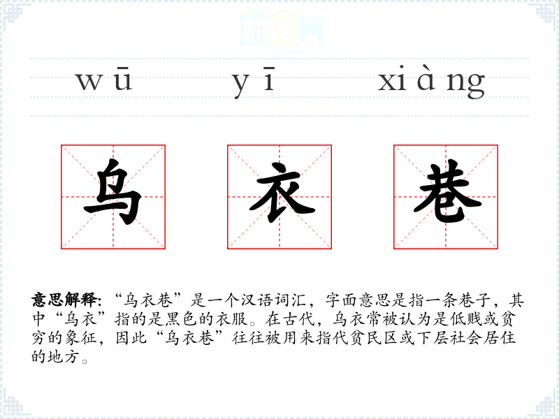 “乌衣巷”是一个汉语词汇,字面意思是指一条巷子,其中“乌衣”指的是黑色的衣服。在古代,乌衣常被认为是低贱或贫穷的象征,因此“乌衣巷”往往被用来指代贫民区或下层社会居住的地方。