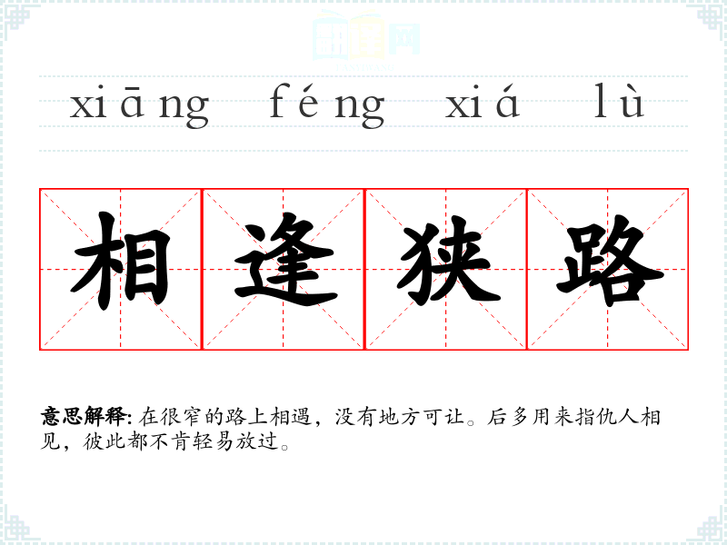 在很窄的路上相遇,没有地方可让。后多用来指仇人相见,彼此都不肯轻易放过。