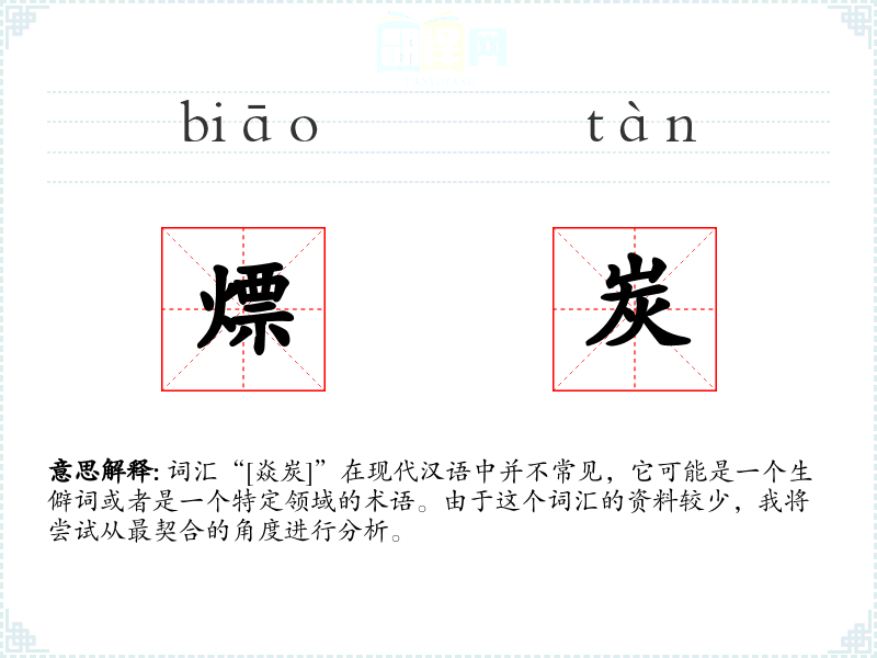 词汇“[焱炭]”在现代汉语中并不常见,它可能是一个生僻词或者是一个特定领域的术语。由于这个词汇的资料较少,我将尝试从最契合的角度进行分析。