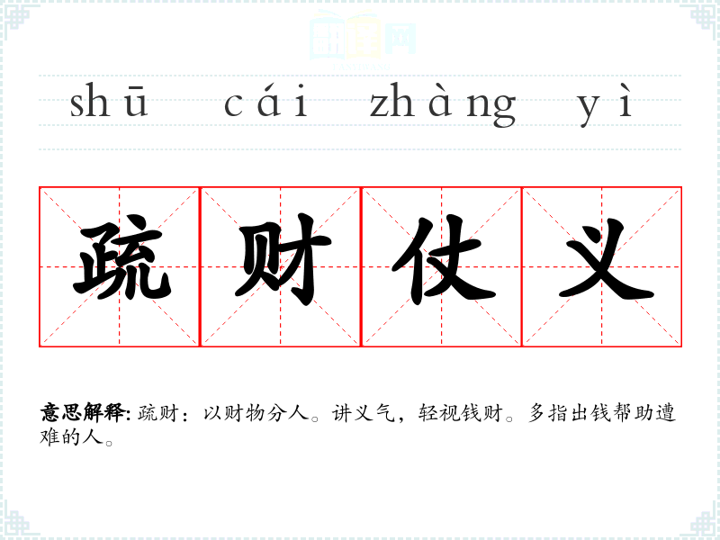 疏财:以财物分人。讲义气,轻视钱财。多指出钱帮助遭难的人。