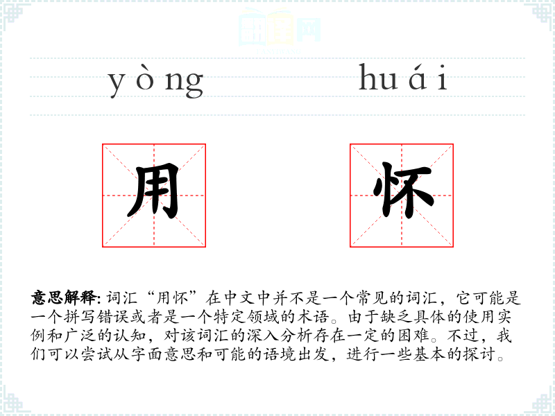总的来说,“用怀”可能是一个拼写错误或者是一个非常特定领域的术语。由于缺乏具体的使用实例和广泛的认知,对该词汇的深入分析存在一定的困难。在语言学习和表达中,我们应当关注那些广泛认知和标准化的词汇,以确保沟通的有效性和准确性。