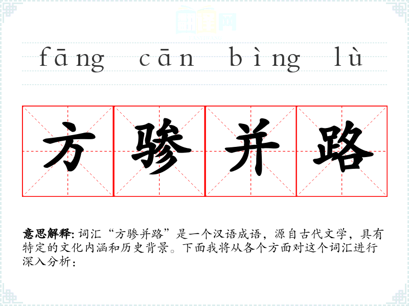 词汇“方骖并路”是一个汉语成语,源自古代文学,具有特定的文化内涵和历史背景。下面我将从各个方面对这个词汇进行深入分析: