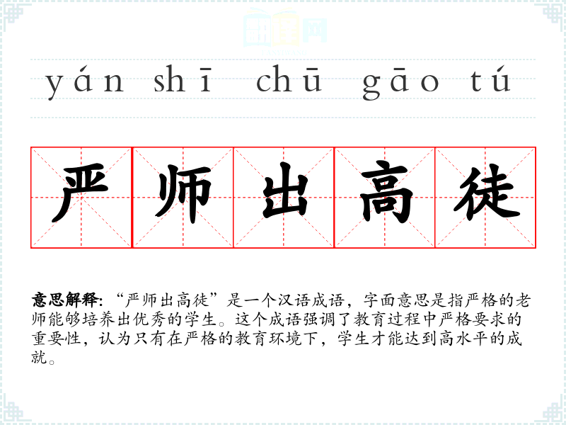 “严师出高徒”是一个汉语成语,字面意思是指严格的老师能够培养出优秀的学生。这个成语强调了教育过程中严格要求的重要性,认为只有在严格的教育环境下,学生才能达到高水平的成就。