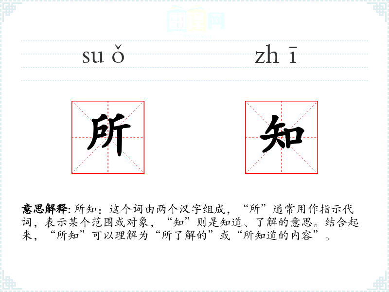 所知:这个词由两个汉字组成,“所”通常用作指示代词,表示某个范围或对象,“知”则是知道、了解的意思。结合起来,“所知”可以理解为“所了解的”或“所知道的内容”。
