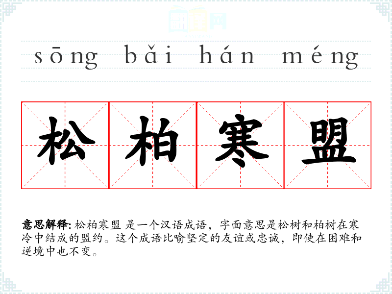 松柏寒盟 是一个汉语成语,字面意思是松树和柏树在寒冷中结成的盟约。这个成语比喻坚定的友谊或忠诚,即使在困难和逆境中也不变。