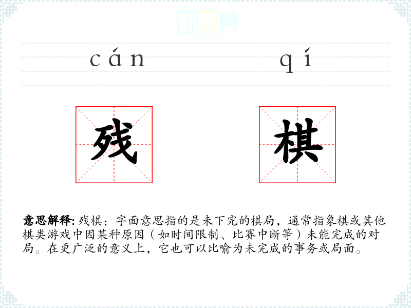 - 专业领域:在棋类比赛中,“残棋”特指那些因比赛规则或特殊情况而未下完的棋局。