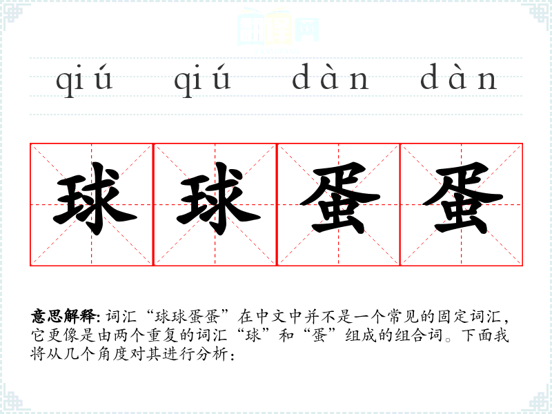 词汇“球球蛋蛋”在中文中并不是一个常见的固定词汇,它更像是由两个重复的词汇“球”和“蛋”组成的组合词。下面我将从几个角度对其进行分析:
