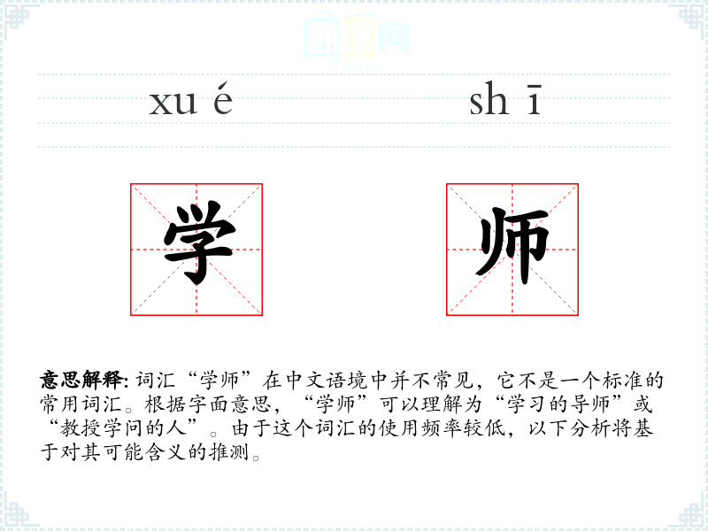 词汇“学师”在中文语境中并不常见,它不是一个标准的常用词汇。根据字面意思,“学师”可以理解为“学*的导师”或“教授学问的人”。由于这个词汇的使用频率较低,以下分析将基于对其可能含义的推测。