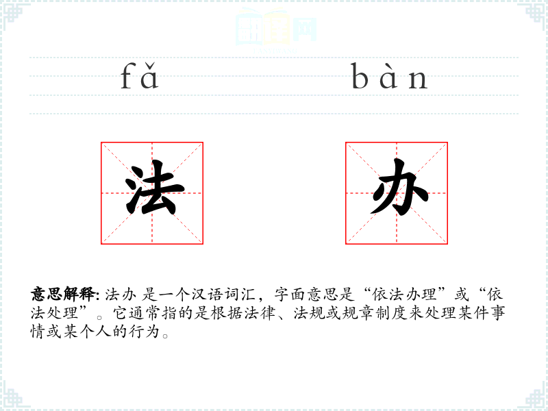 法办 是一个汉语词汇,字面意思是“依法办理”或“依法处理”。它通常指的是根据法律、法规或规章制度来处理某件事情或某个人的行为。