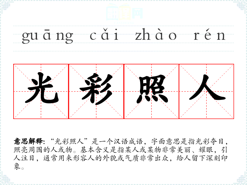 “光彩照人”是一个汉语成语,字面意思是指光彩夺目,照亮周围的人或物。基本含义是指某人或某物非常美丽、耀眼,引人注目,通常用来形容人的外貌或气质非常出众,给人留下深刻印象。