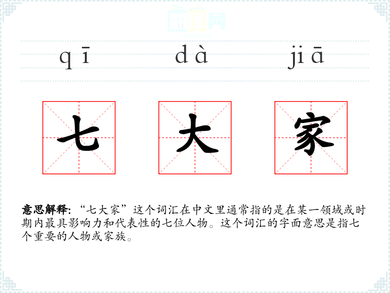 “七大家”这个词汇在中文里通常指的是在某一领域或时期内最具影响力和代表性的七位人物。这个词汇的字面意思是指七个重要的人物或家族。