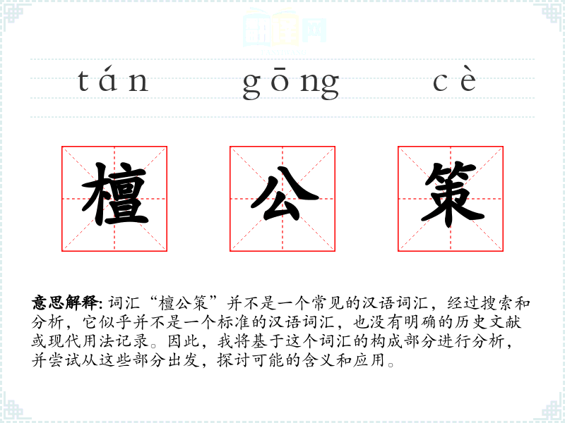 词汇“檀公策”并不是一个常见的汉语词汇,经过搜索和分析,它似乎并不是一个标准的汉语词汇,也没有明确的历史文献或现代用法记录。因此,我将基于这个词汇的构成部分进行分析,并尝试从这些部分出发,探讨可能的含义和应用。