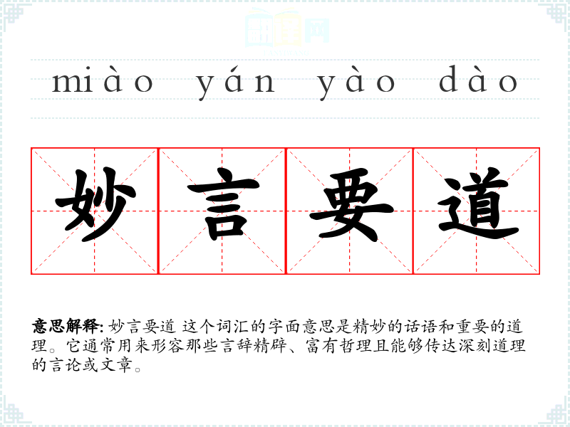 妙言要道 这个词汇的字面意思是精妙的话语和重要的道理。它通常用来形容那些言辞精辟、富有哲理且能够传达深刻道理的言论或文章。