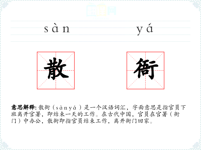 散衙(sàn yá)是一个汉语词汇,字面意思是指官员下班离开官署,即结束一天的工作。在古代**,官员在官署(衙门)中办公,散衙即指官员结束工作,离开衙门回家。