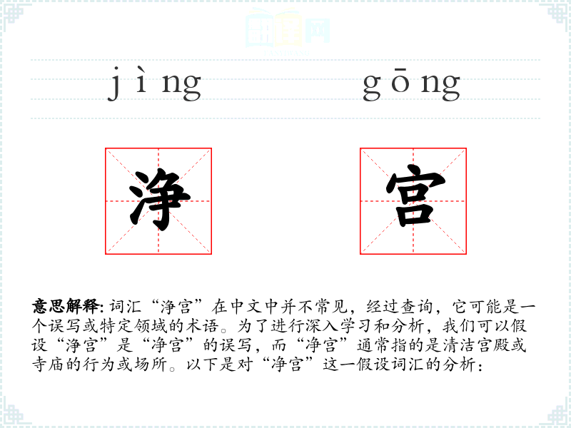 - 词源:净,源自古代汉语,意为清洁;宫,古代指宫殿或庙宇。