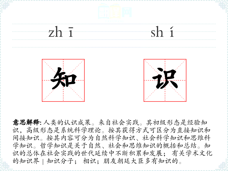 1.人类的认识成果。来自社会实践。其初级形态是经验知识,高级形态是系统科学理论。按其获得方式可区分为直接知识和间接知识。按其内容可分为自然科学知识、社会科学知识和思维科学知识。哲学知识是关于自然、社会和思维知识的概括和总结。知识的总体在社会实践的世代延续中不断积累和发展; 有关学术文化的知识界|知识分子; 相识;朋友朝廷大臣多有知识的。