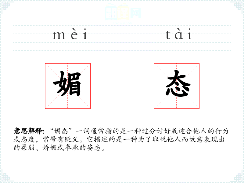 “媚态”一词通常指的是一种过分讨好或迎合他人的行为或态度,常带有贬义。它描述的是一种为了取悦他人而故意表现出的柔弱、娇媚或奉承的姿态。