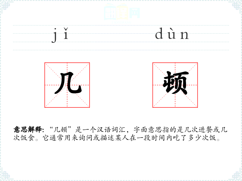 “几顿”由“几”和“顿”两个字组成。“几”表示数量不多的意思,“顿”原指停顿或停留,后引申为进餐的次数。在古代汉语中,“顿”也有表示吃饭的意思,如“一饭三吐哺”。
