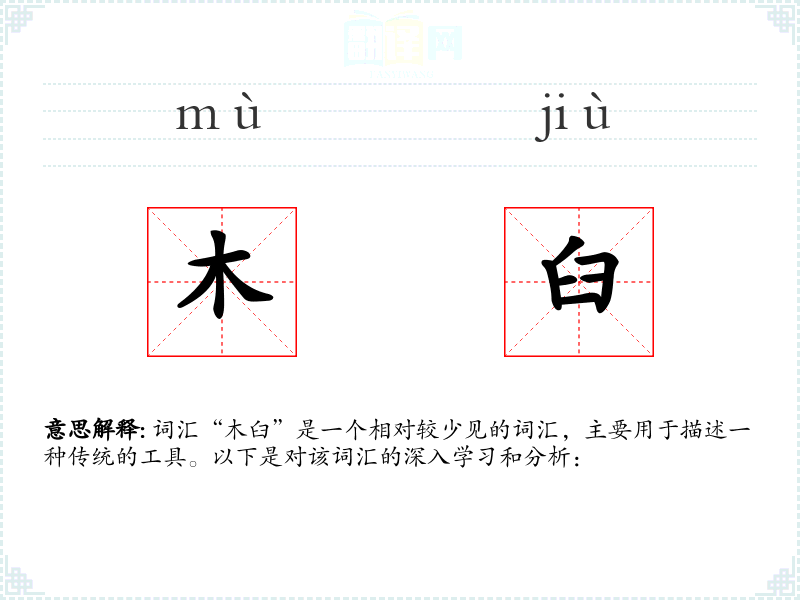 词汇“木臼”是一个相对较少见的词汇,主要用于描述一种传统的工具。以下是对该词汇的深入学*和分析: