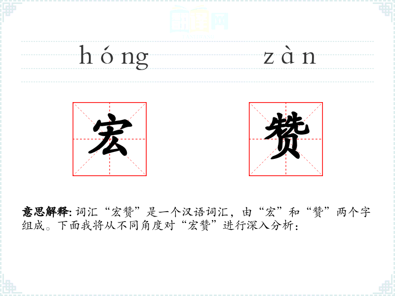 - 字面意思:“宏”通常指宏大、宏伟,表示规模或范围的广阔;“赞”则表示赞美、称赞,表示对某人或某事的正面评价。