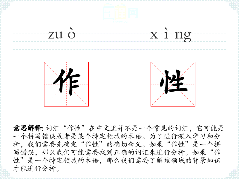 - 由于“作性”不是一个常见的词汇,它不太可能引起特定的视觉和听觉联想。