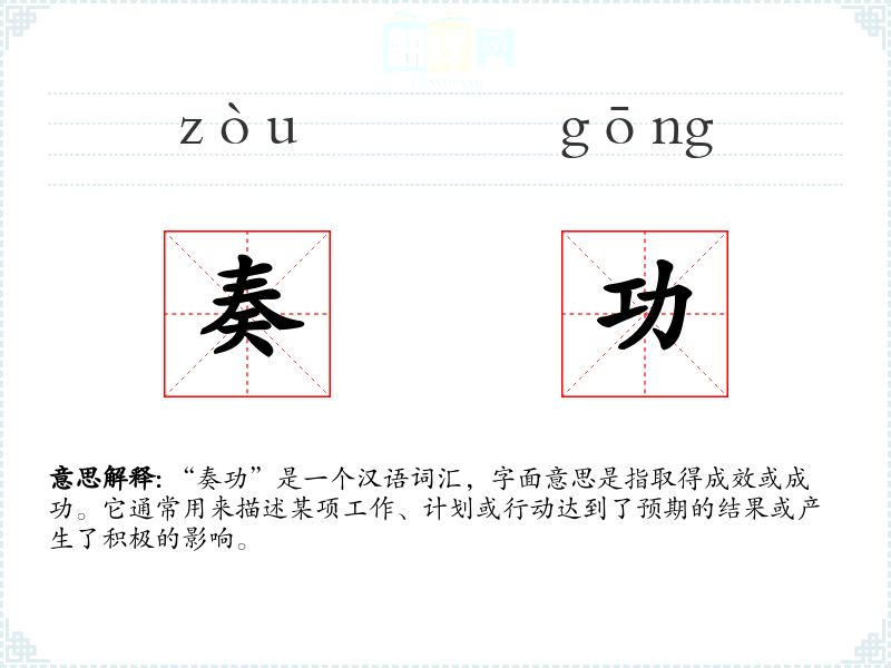 “奏功”是一个汉语词汇,字面意思是指取得成效或成功。它通常用来描述某项工作、计划或行动达到了预期的结果或产生了积极的影响。