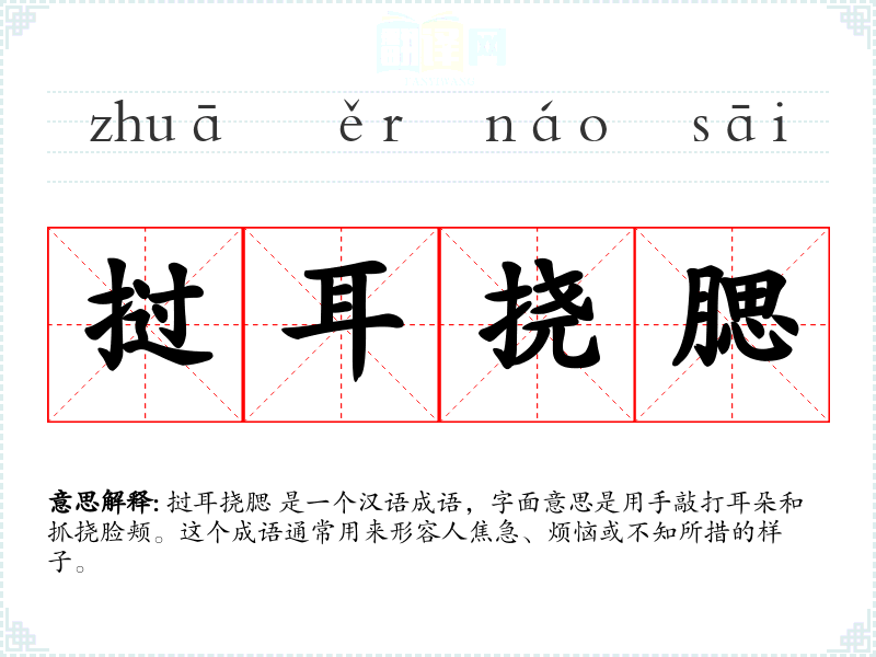 挝耳挠腮 是一个汉语成语,字面意思是用手敲打耳朵和抓挠脸颊。这个成语通常用来形容人焦急、烦恼或不知所措的样子。