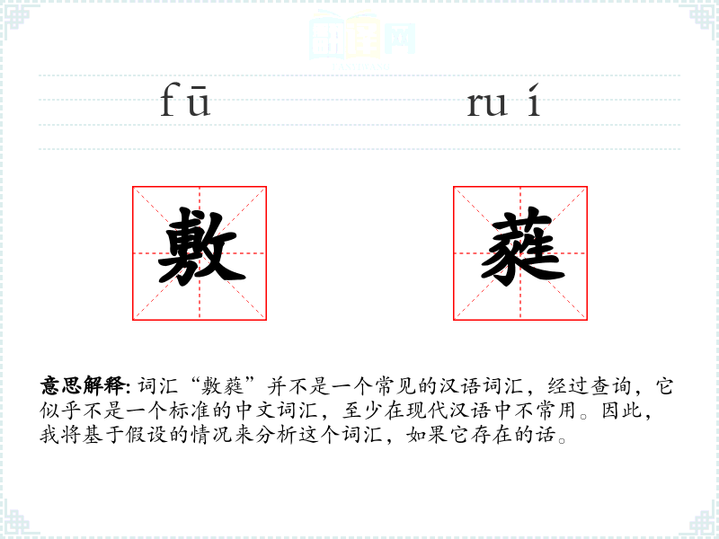 词汇“敷蕤”并不是一个常见的汉语词汇,经过查询,它似乎不是一个标准的中文词汇,至少在现代汉语中不常用。因此,我将基于假设的情况来分析这个词汇,如果它存在的话。