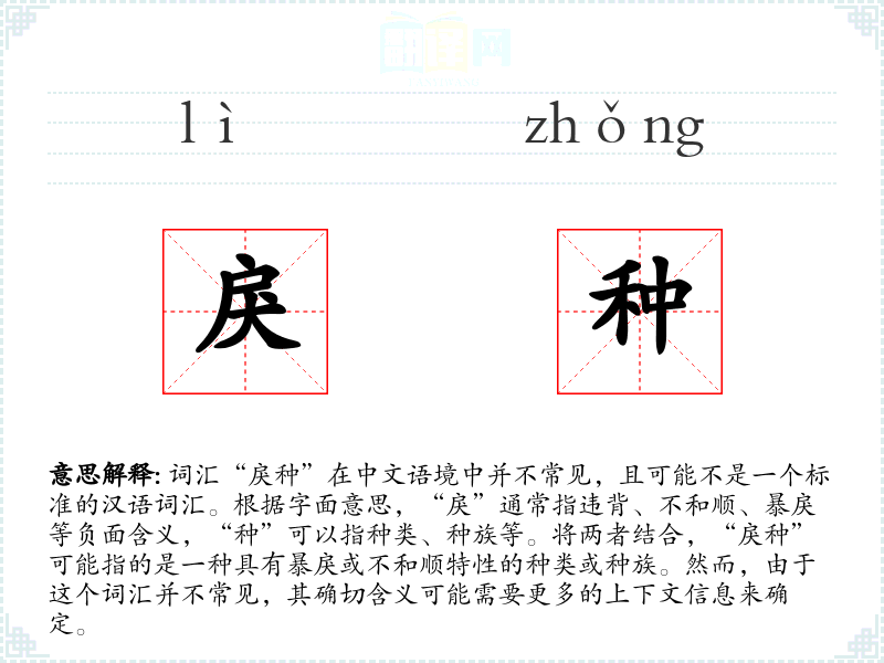 词汇“戾种”在中文语境中并不常见,且可能不是一个标准的汉语词汇。根据字面意思,“戾”通常指违背、不和顺、暴戾等负面含义,“种”可以指种类、种族等。将两者结合,“戾种”可能指的是一种具有暴戾或不和顺特性的种类或种族。然而,由于这个词汇并不常见,其确切含义可能需要更多的上下文信息来确定。
