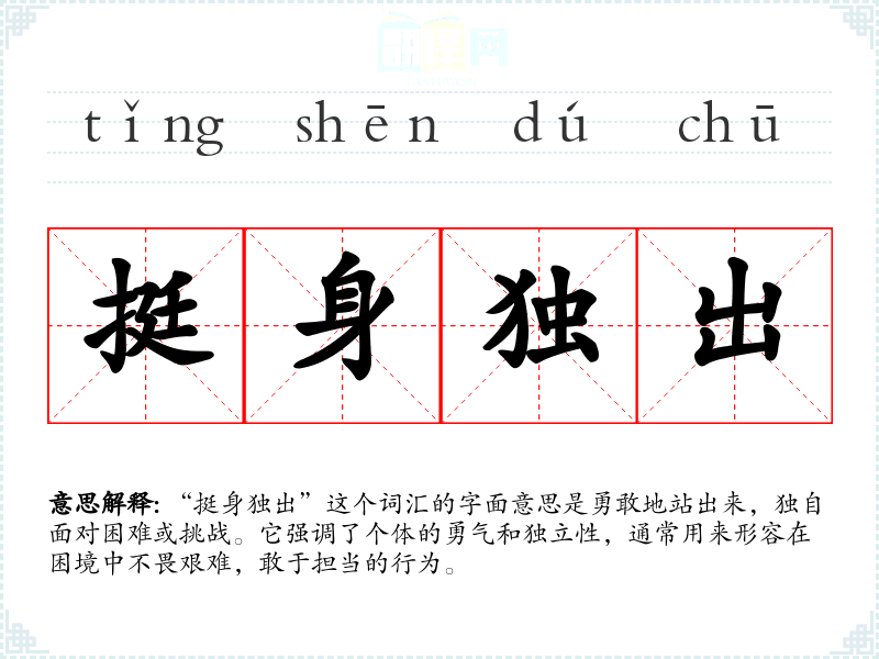 “挺身独出”这个词汇的字面意思是勇敢地站出来,独自面对困难或挑战。它强调了个体的勇气和独立性,通常用来形容在困境中不畏艰难,敢于担当的行为。