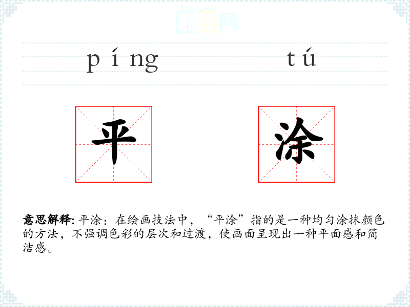 - 专业领域:在美术教育或艺术评论中,“平涂”是一个常用术语,用来描述特定的绘画技巧。