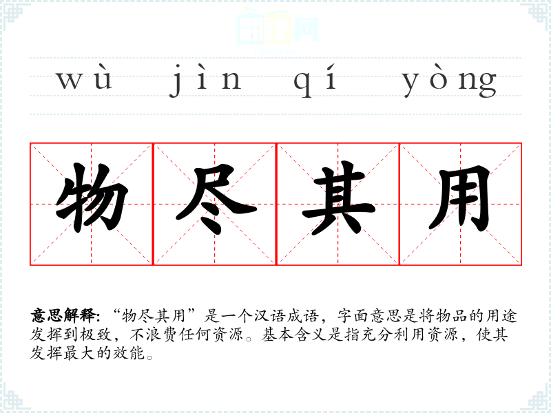 “物尽其用”是一个汉语成语,字面意思是将物品的用途发挥到极致,不浪费任何资源。基本含义是指充分利用资源,使其发挥最大的效能。