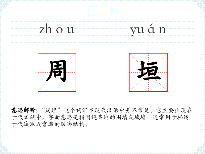 在文学作品中,“周垣”可能被用来营造一种古朴、庄严的氛围,尤其是在描述古代战争或宫廷场景时。在口语中,这个词汇几乎不再使用,但在历史学、考古学等专业领域,它可能被用来精确描述古代建筑的特征。