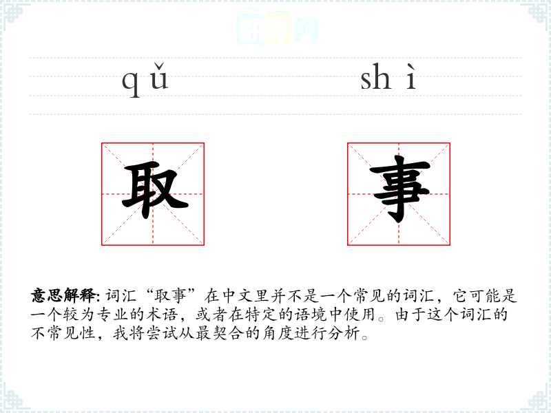 词汇“取事”在中文里并不是一个常见的词汇,它可能是一个较为专业的术语,或者在特定的语境中使用。由于这个词汇的不常见性,我将尝试从最契合的角度进行分析。
