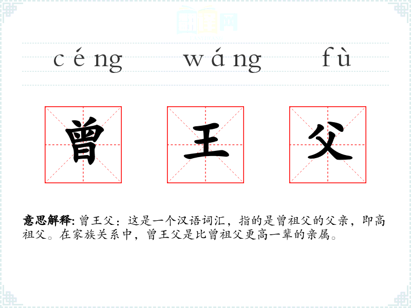 同义词:高祖父(在家族关系中与曾王父同义) 反义词:曾孙(曾王父的直系后代)