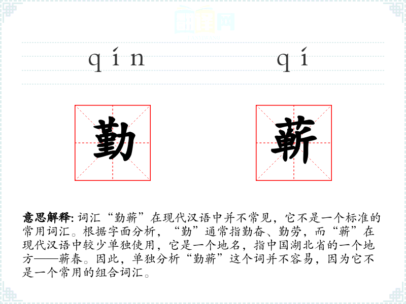 在文化与社会背景中,如果“勤蕲”被用来描述蕲春地区的人民,那么它可能与该地区的历史、文化和经济活动有关,强调当地人民的勤劳和坚韧。