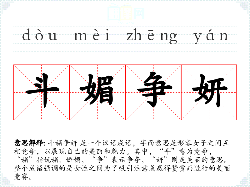 斗媚争妍 是一个汉语成语,字面意思是形容女子之间互相竞争,以展现自己的美丽和魅力。其中,“斗”意为竞争,“媚”指妩媚、娇媚,“争”表示争夺,“妍”则是美丽的意思。整个成语强调的是女性之间为了吸引注意或赢得赞赏而进行的美丽竞赛。
