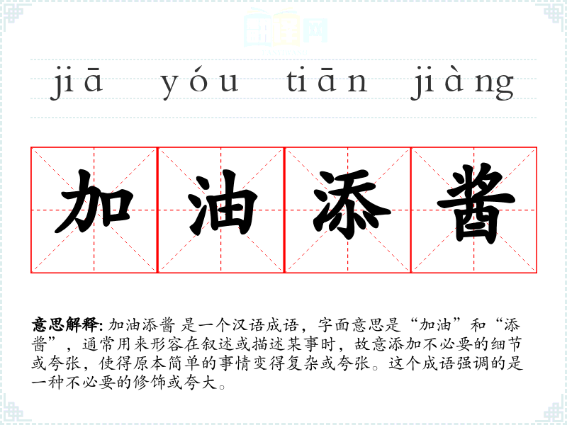加油添酱 是一个汉语成语,字面意思是“加油”和“添酱”,通常用来形容在叙述或描述某事时,故意添加不必要的细节或夸张,使得原本简单的事情变得复杂或夸张。这个成语强调的是一种不必要的修饰或夸大。