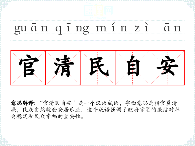 “官清民自安”是一个汉语成语,字面意思是指官员清廉,民众自然就会安居乐业。这个成语强调了政府官员的廉洁对社会稳定和民众幸福的重要性。