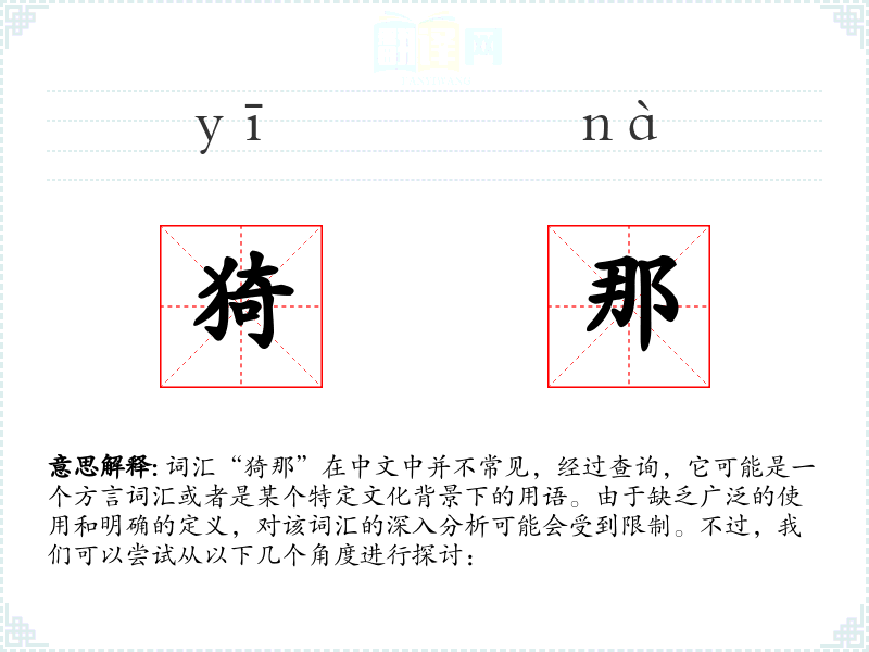 词汇“猗那”在中文中并不常见,经过查询,它可能是一个方言词汇或者是某个特定文化背景下的用语。由于缺乏广泛的使用和明确的定义,对该词汇的深入分析可能会受到限制。不过,我们可以尝试从以下几个角度进行探讨: